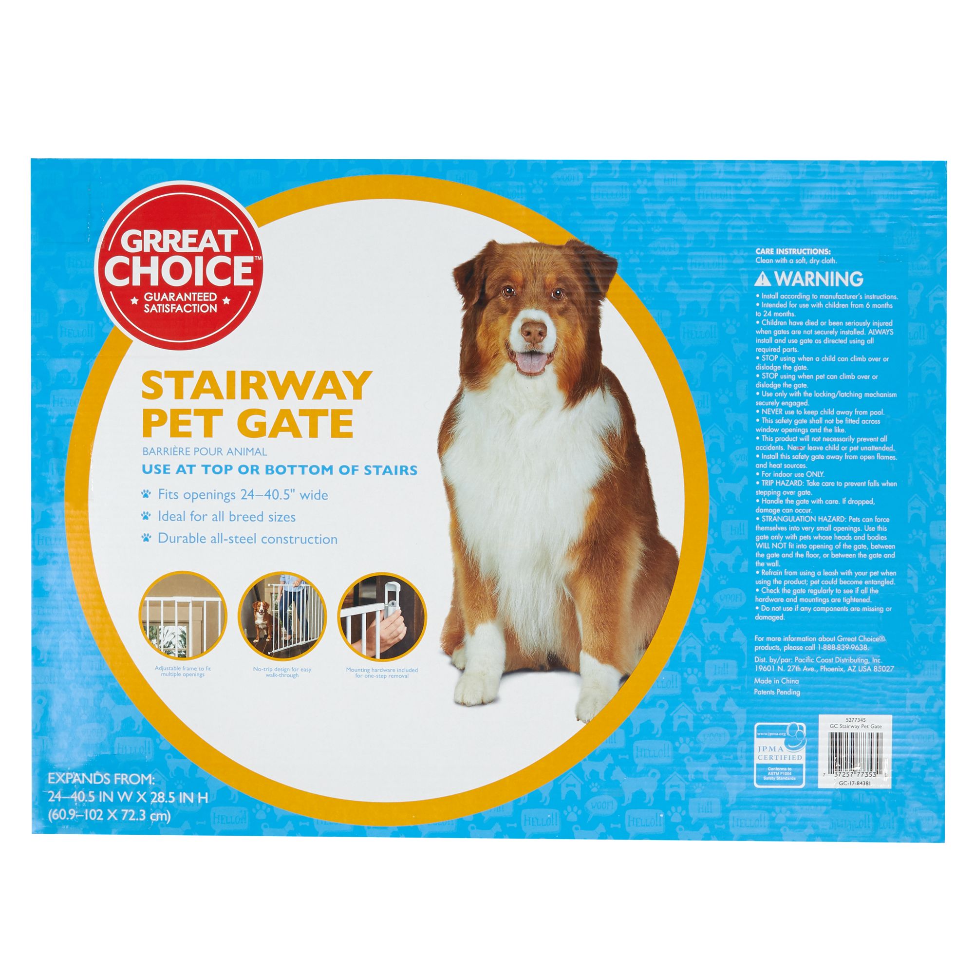 Carlson extra wide walk through pet gate with small pet door includes 4 inch extension kit pressure mount kit and wall mount kit.