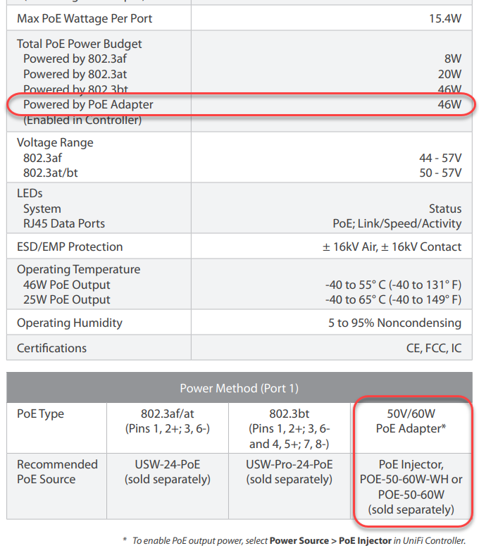 To enable its maximum power budget of 46w the usw flex can be powered by the usw industrial us xg 6poe usw pro 24 poe or usw pro 48 poe switches which provide 60w of 802 3bt poe.